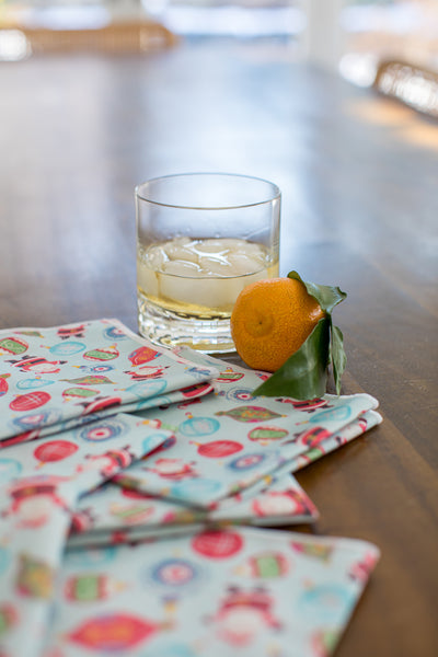 Sweet, hand drawn repeating patterns featuring colorful vintage Christmas ornaments, Champagne bottles or retro ski. Shown on a lovely cotton sateen fabric that makes a perfect cocktail napkin for the holiday season.
